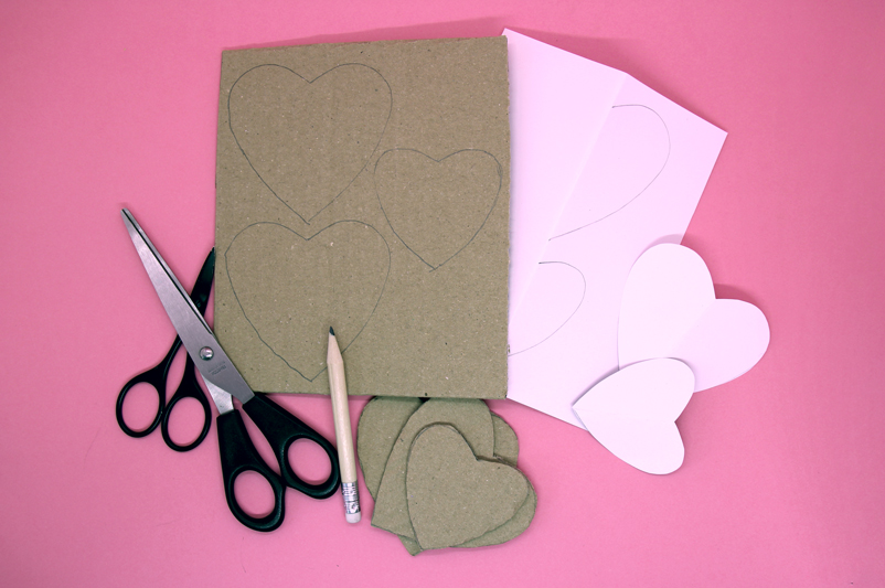 Nejdříve si udělej z papíru šablonku menšího a většího srdíčka. Papír slož na polovinu, předkresli srdíčka a vystřihni. Papírová srdíčka obkresli na karton a vystřihni, lépe ti to půjde zakulacenými nůžkami.
