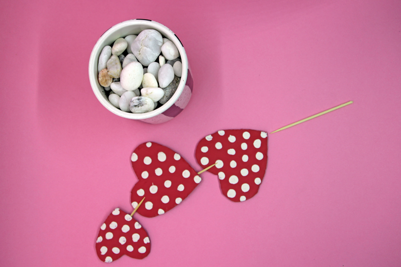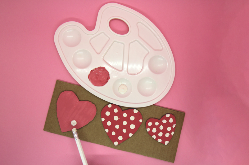 Pomocí gumy na tužce udělej bílou barvou puntíky na srdíčka. Můžeš je udělat jen na jednu stranu, nebo na obě.